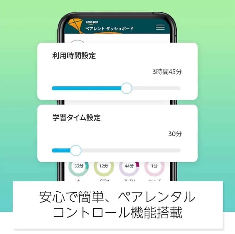 Fire 7 キッズモデルは、Amazonのペアレンタルコントロール機能が標準搭載されており、「使わせすぎ防止」や「不適切なコンテンツの制限」など、保護者がしっかりと使用状況を管理できます。
